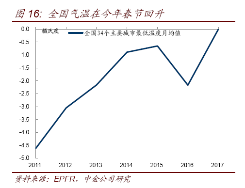 从CPI来看,尽管全球的CPI回升速度较快,而中国的PPI的快速上升也会对CPI带来传导压力,但我们认为CPI未来几个月的涨幅仍相对可控,甚至可能低于此前市场的预期。主要是食品价格在同比上会带来拖累,压制整体CPI的上升。尤其是今年春节感受最深的是气温明显高于去年春节,是近几年的一个“暖春”,这使得蔬菜水果的生长也较去年春节明显改善。2016年全国的寒潮天气导致大部分的蔬菜被冻坏,蔬菜价格暴涨,春节期间一斤蔬菜都要高达十元以上,也因此形成了高基数效应。从我们统计的34个重要城市的数据来看(图16),今年1月份的气温明显高于过去几年,使得蔬菜价格的涨幅相对温和,加上猪肉价格涨幅也不高,今年春节前的食品价格涨幅在过去历年来看属于中等偏下(图17),使得今年 1月份食品价格同比涨幅明显低于预期,也会带动1月份CPI上涨低于预期。目前估计1月份CPI涨幅可能在2.5%附近,低于此前市场预计的可能接近3%的水平。而在去年高基数影响下,2月份CPI将会快速回落至1.0%-1.5%之间水平,从而压制未来几个月CPI的同比涨幅。从这个角度上而言,国内CPI较全球CPI的上升更为可控,尽管PPI对非食品CPI有传导,但食品CPI起到了抵消作用。