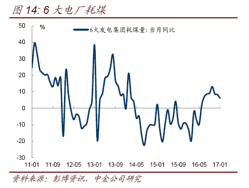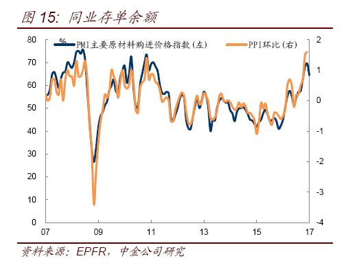 而2月1日公布的1月份中采PMI数据和财新PMI数据则要相对逊色一些。我们在简评《1月份PMI小幅回落,库存回补,工业品涨幅放缓》也提到,春节落在一月份使得PMI受到一定影响,毕竟春节错位使得季调无法完全剔除春节影响。不过从一些微观细节来看(图14),12月份以来工业整体生产有所放缓,主要可能是受到全国更为严格的环保限产影响以及货币政策收紧对企业信心造成冲击。不过在2016年春节前后低基数影响下,今年1、2月份工业生产的同比增速仍不会低。此外,从PMI数据本身来看,工业企业库存从低位开始重新累积,进入补库存过程,会逐步限制工业品价格的涨幅。从PMI的主要原材料购进价格指数来看(图15),1月份工业品价格环比涨幅有所放缓,与我们观察到的高频数据一致。后续来看,工业品价格难以再出现去年4季度那么快的上涨,环比涨幅可能会逐步回落。总体上来看,在2016年年初低基数影响下,我们预计1月份PPI同比仍会明显上涨,同比可能升至6.5%附近,但同比涨幅可能会在2-3月份筑顶,随后开始回落。PPI压力最大的阶段正在逐步过去。