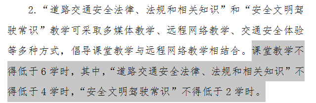 而且从学时的安排来看,更加注重于道路交通法律法规相关知识和实际道路驾驶技能的教学。新《大纲》还明确指出,“课堂教学不得低于6学时,其中,“道路交通安全法律、法规和相关知识”不得低于4学时,“安全文明驾驶常识”不得低于2学时。”