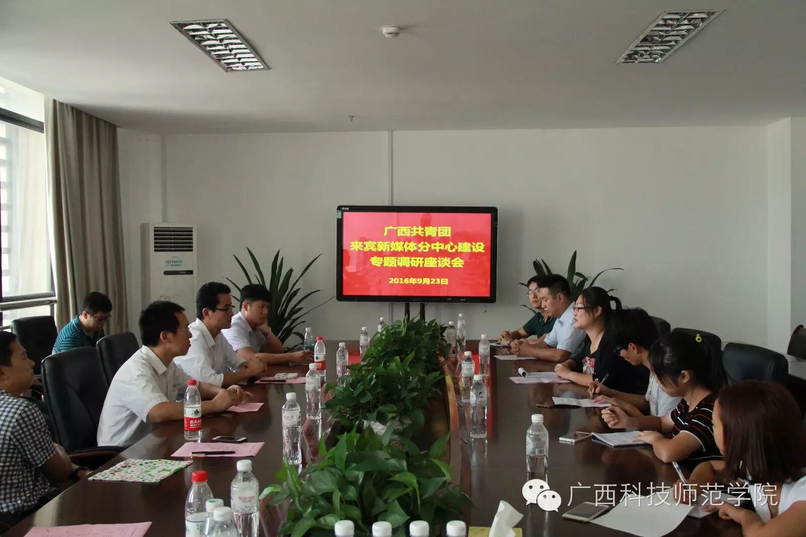 “广西来宾新媒体分中心建设专题调研座谈会”在我校召开,广西区委副书记刘玄启、我校党委副书记吴江萍、来宾市委书记范洪亮、我校团委书记陈莲琦、校团委、校新媒体中心部分学生等出席了座谈会,会前领导参观了我校易班工作站以及我校新媒体中心。