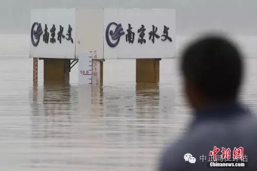 资料图:7月6日,一位市民在长江南京下关水文标尺前经过。当日,南京水文局发布的信息显示,长江水位上涨迅速,最高峰达9.8米,持续超过警戒线。中新社记者 泱波 摄