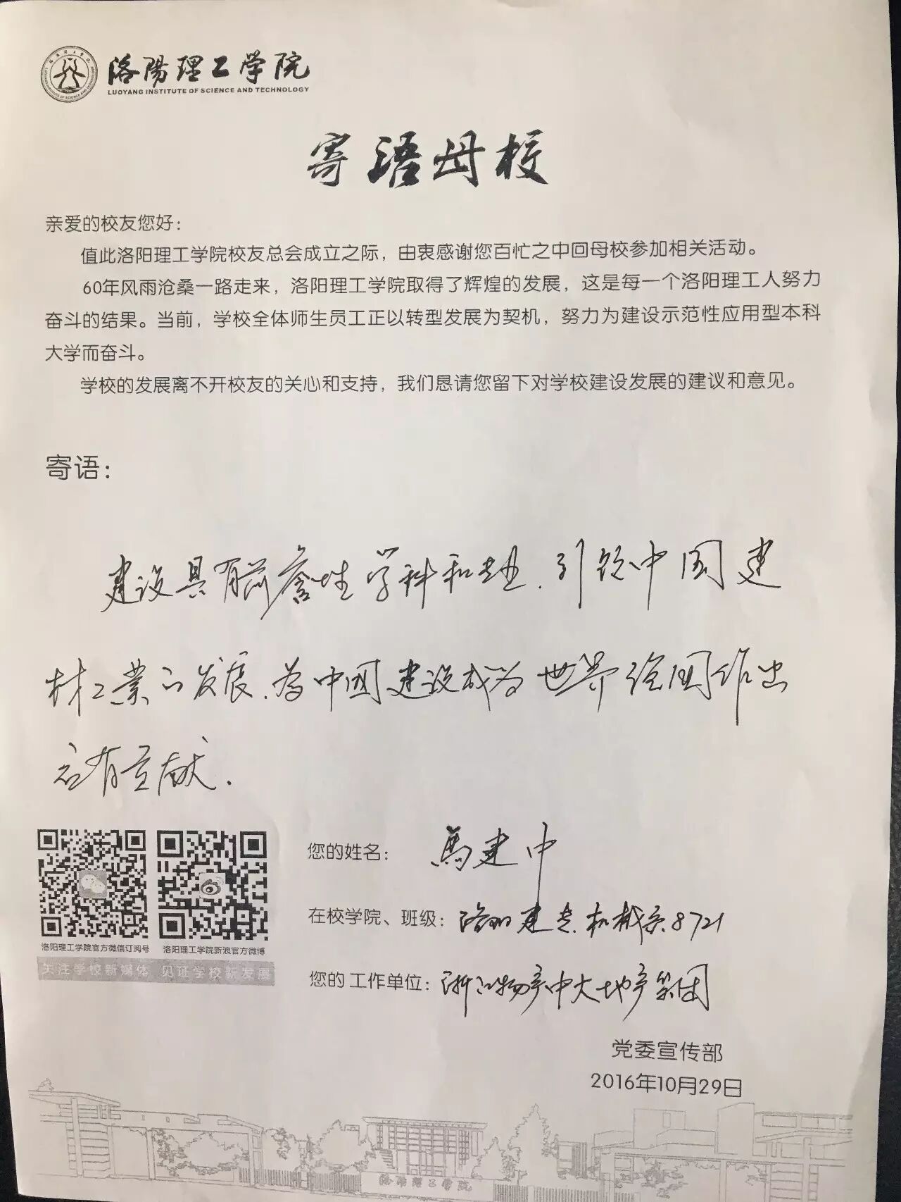 手写版“校友寄语” 真诚祝愿亲爱的母校:继续发展壮大,继续人才倍出;继续独领风骚,继续专业领先 ;继续兼容并蓄,继续海纳百川。 赵详增 积古都历史之厚蕴,育万千栋梁之才,结丰茂教科硕果。祝愿母校:再创辉煌,再展宏图,再谱华章! 孙永利 祝愿母校“应用型”明天更美好! 胡全洲 周丹舟 周丹舟:坚持学校在建材行业方面的特色,着力培养有社会责任感和家国情怀的应用型人才。有特色的学校才有生命力。