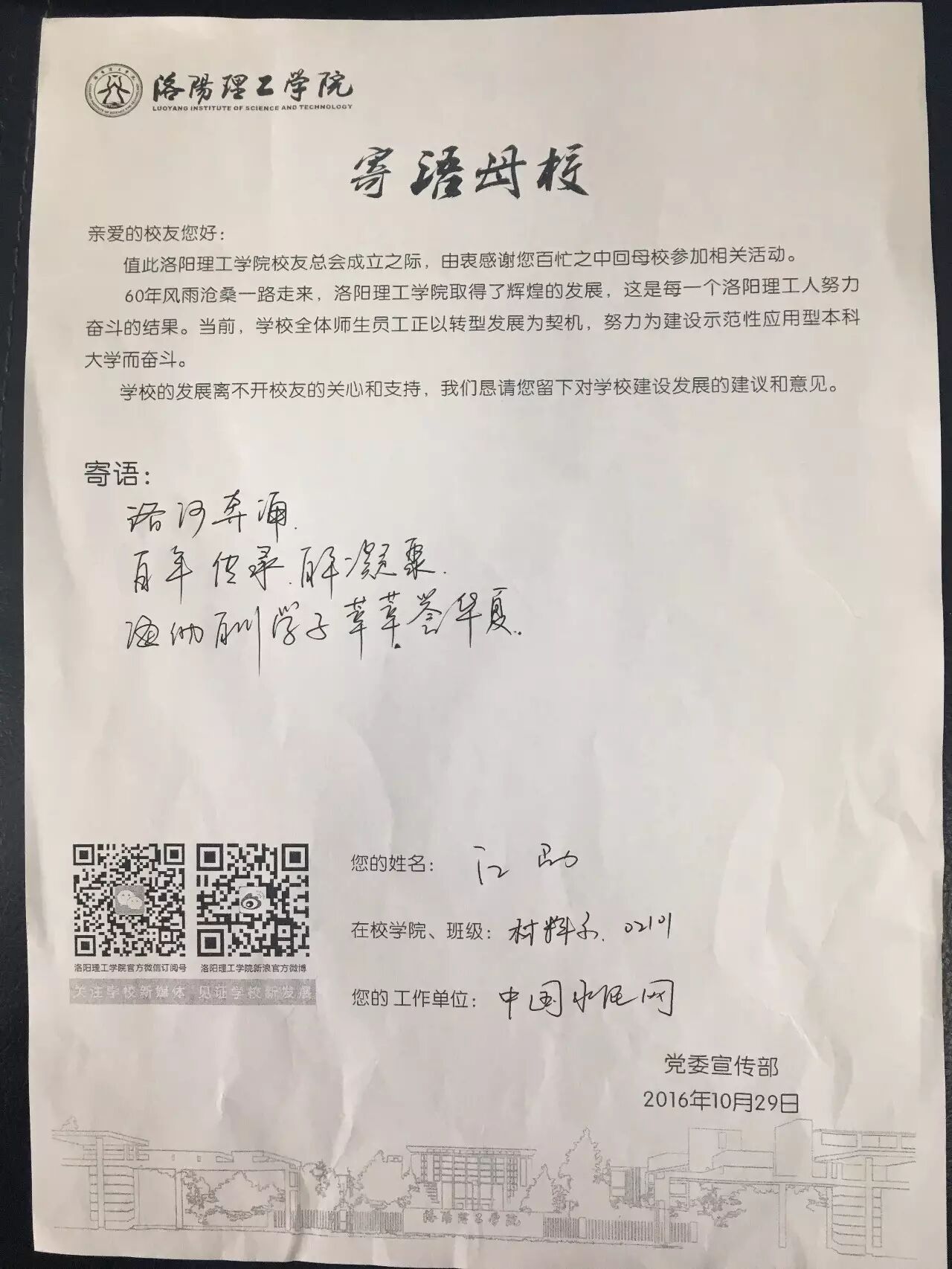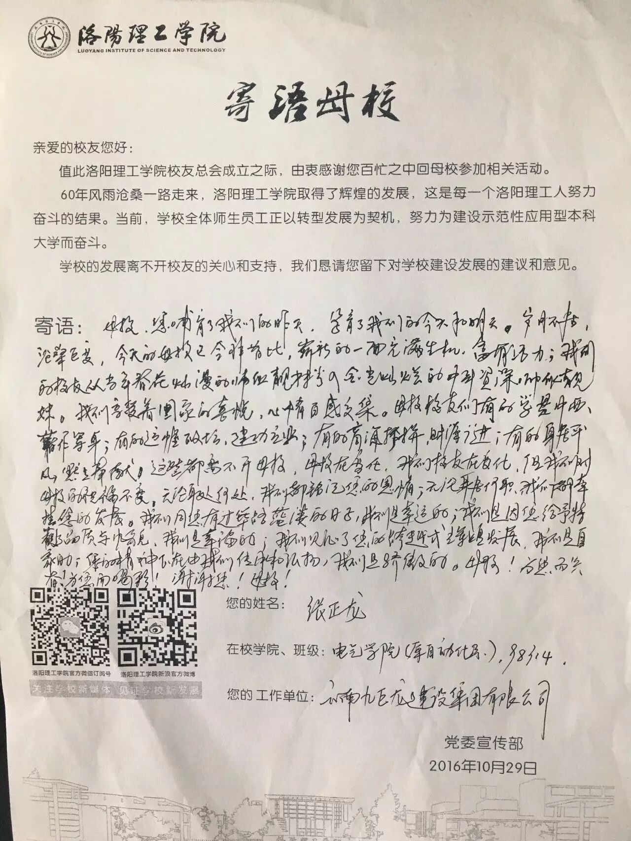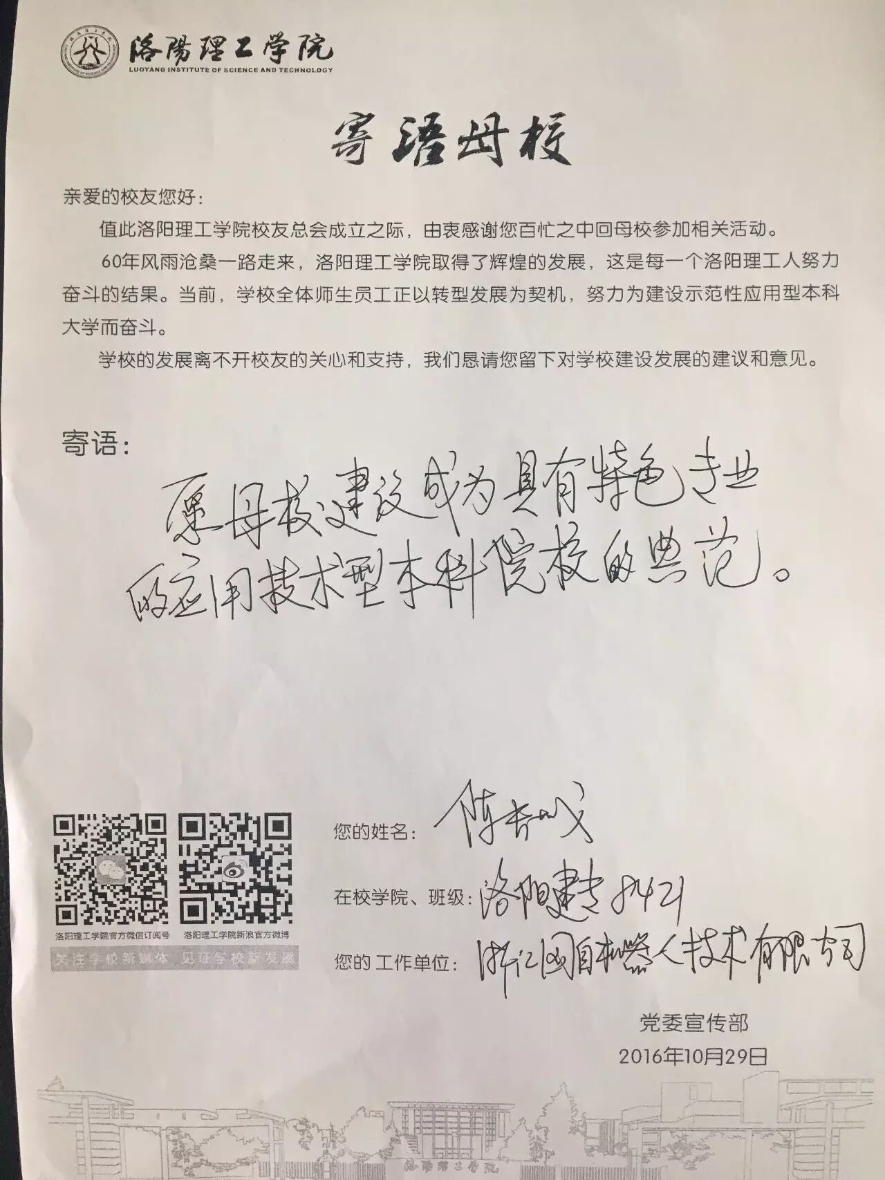 答:我非常自豪自己曾是理工的一份子。虽然当时条件艰苦,但回头看在校期间并没有遗憾,因为曾经奋斗过,曾经拥有团结向上的团队,很兴奋。洛理坐落在洛阳这个传承文化底蕴的城市,校园的文化和底蕴也会传播深远。
