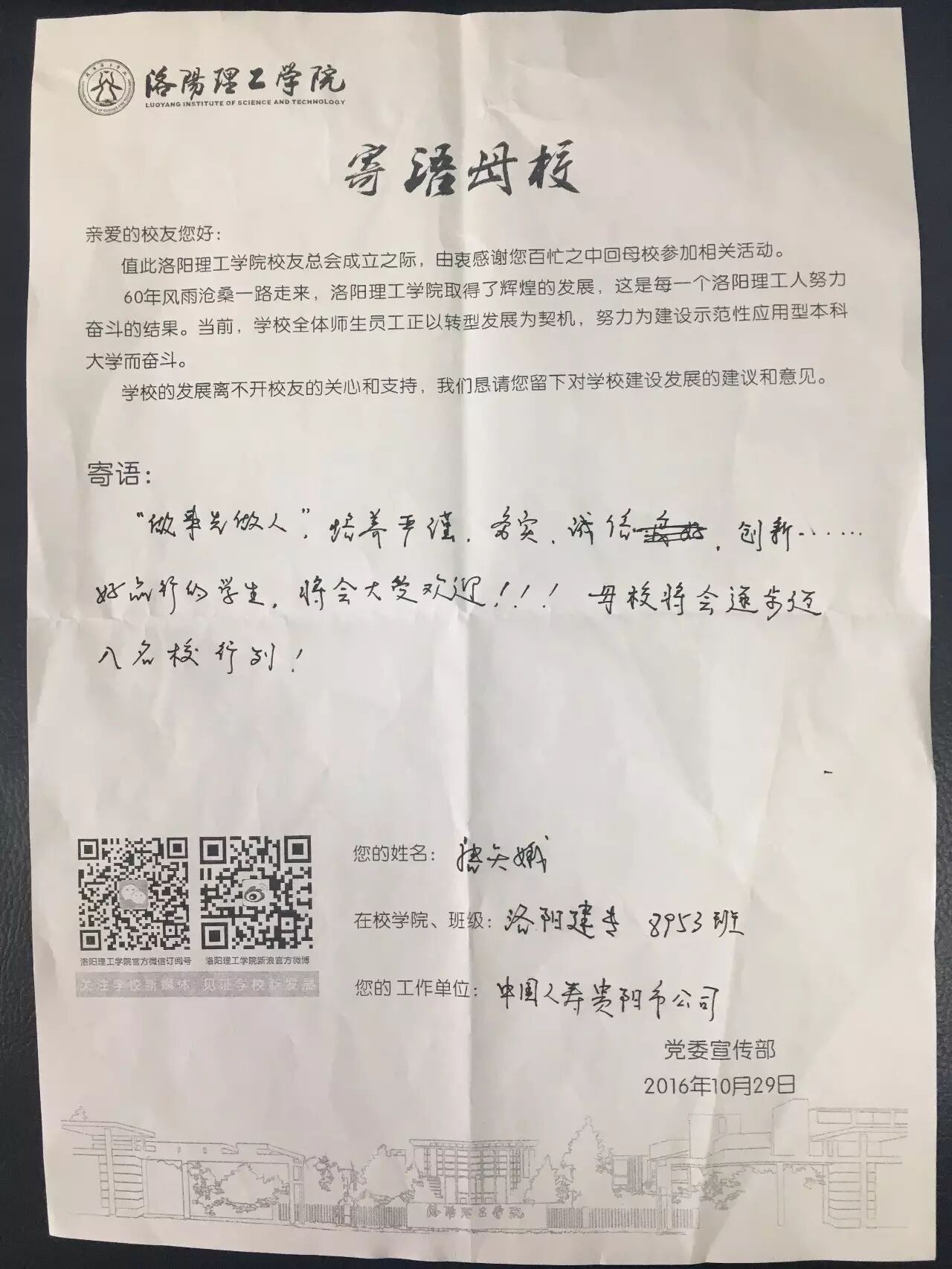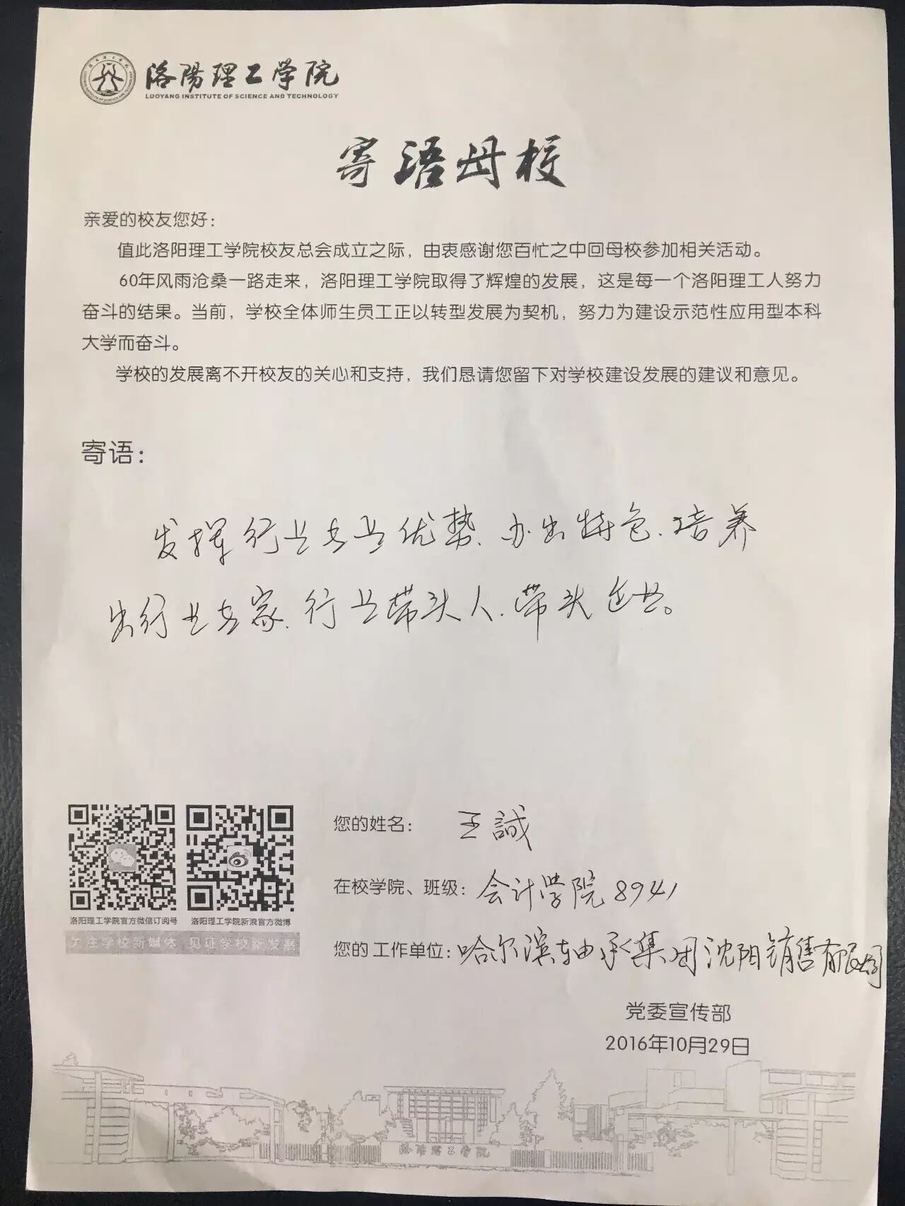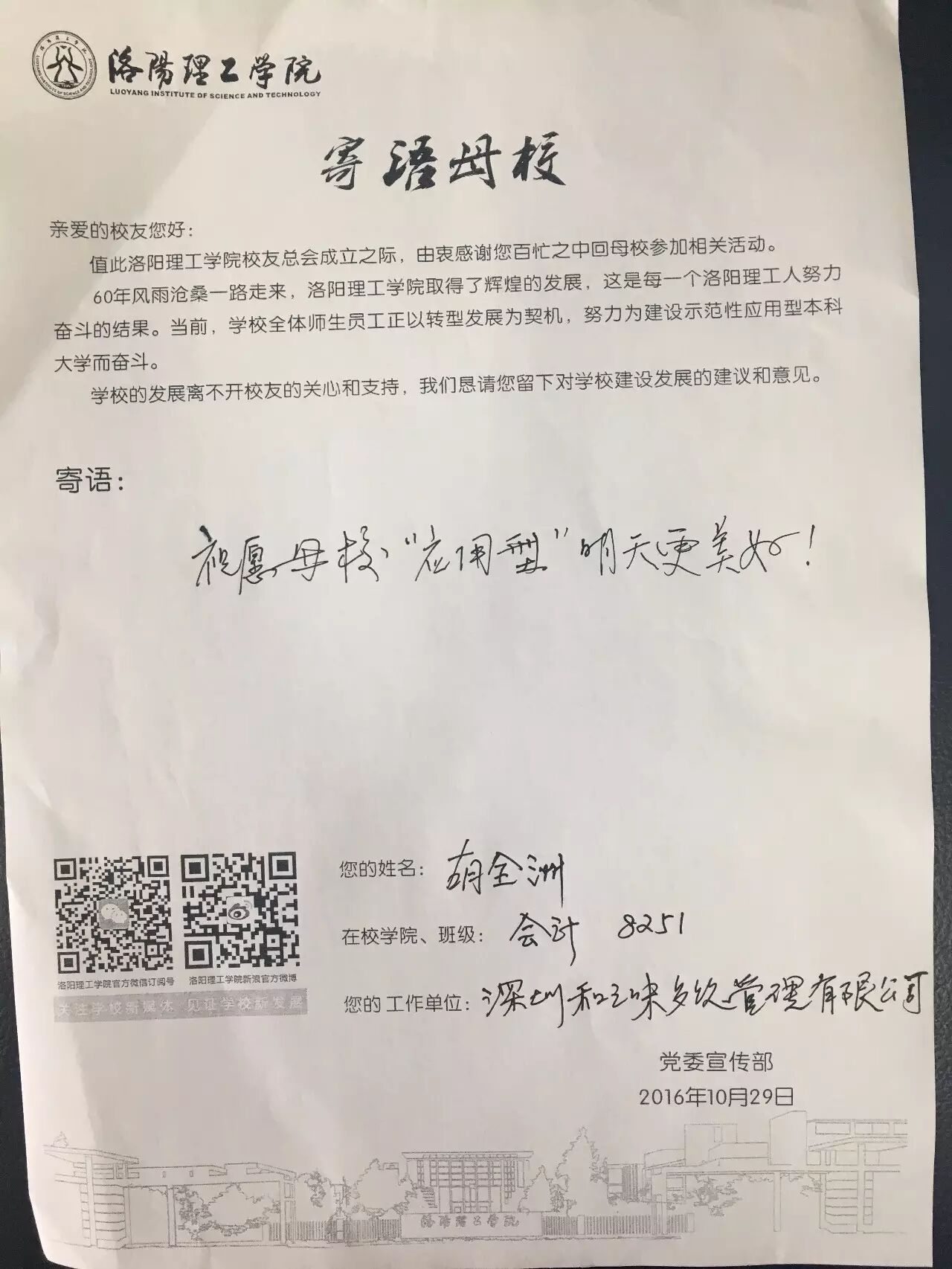 答:我非常自豪自己曾是理工的一份子。虽然当时条件艰苦,但回头看在校期间并没有遗憾,因为曾经奋斗过,曾经拥有团结向上的团队,很兴奋。洛理坐落在洛阳这个传承文化底蕴的城市,校园的文化和底蕴也会传播深远。