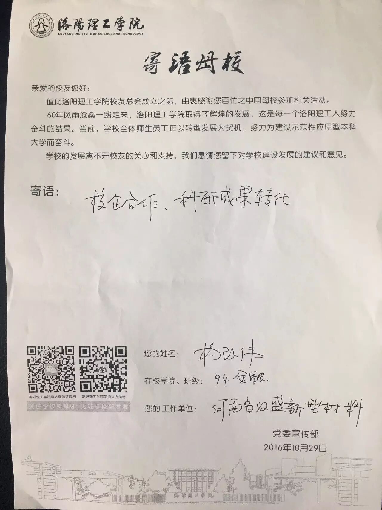 任吉忠 洛阳地灵人杰,感恩母校的培养,祝福广大学弟学妹学有大成,祝愿洛阳理工在新的征程中创造新的辉煌。 杨改伟 杨改伟:校企合作,科研成果转化