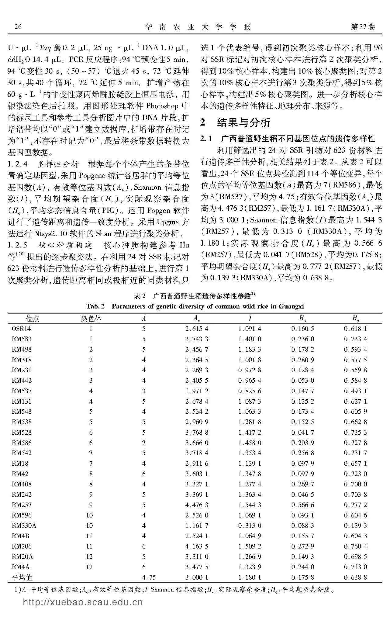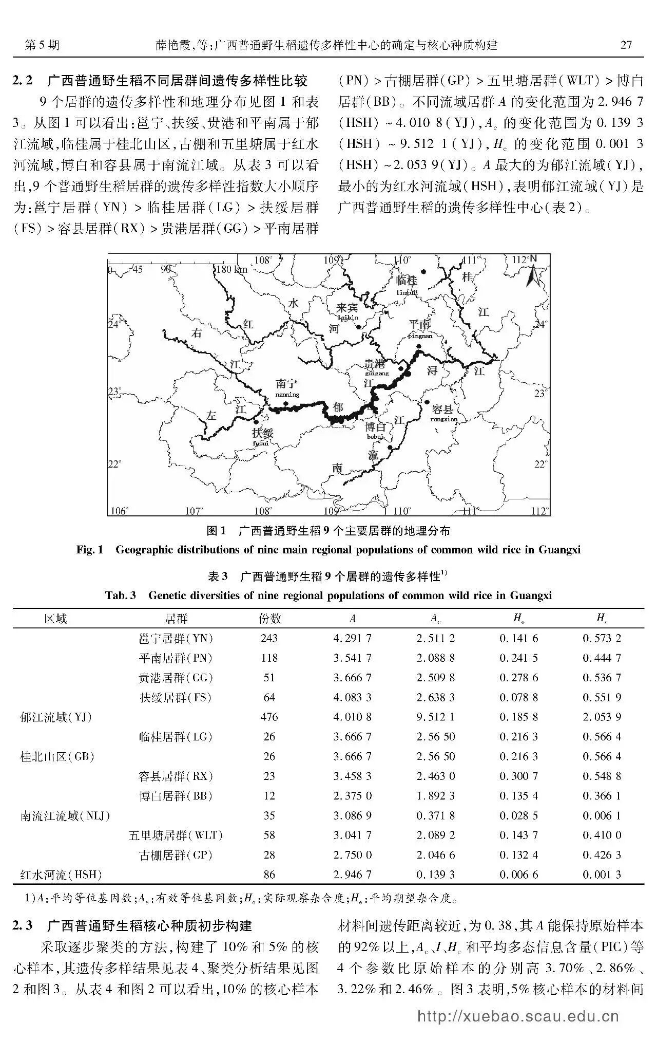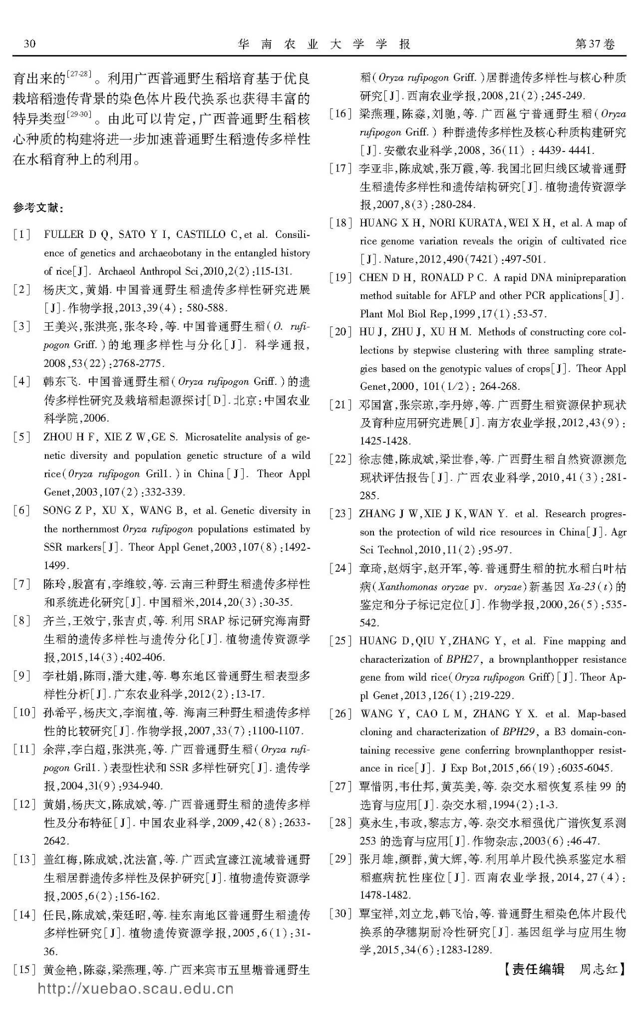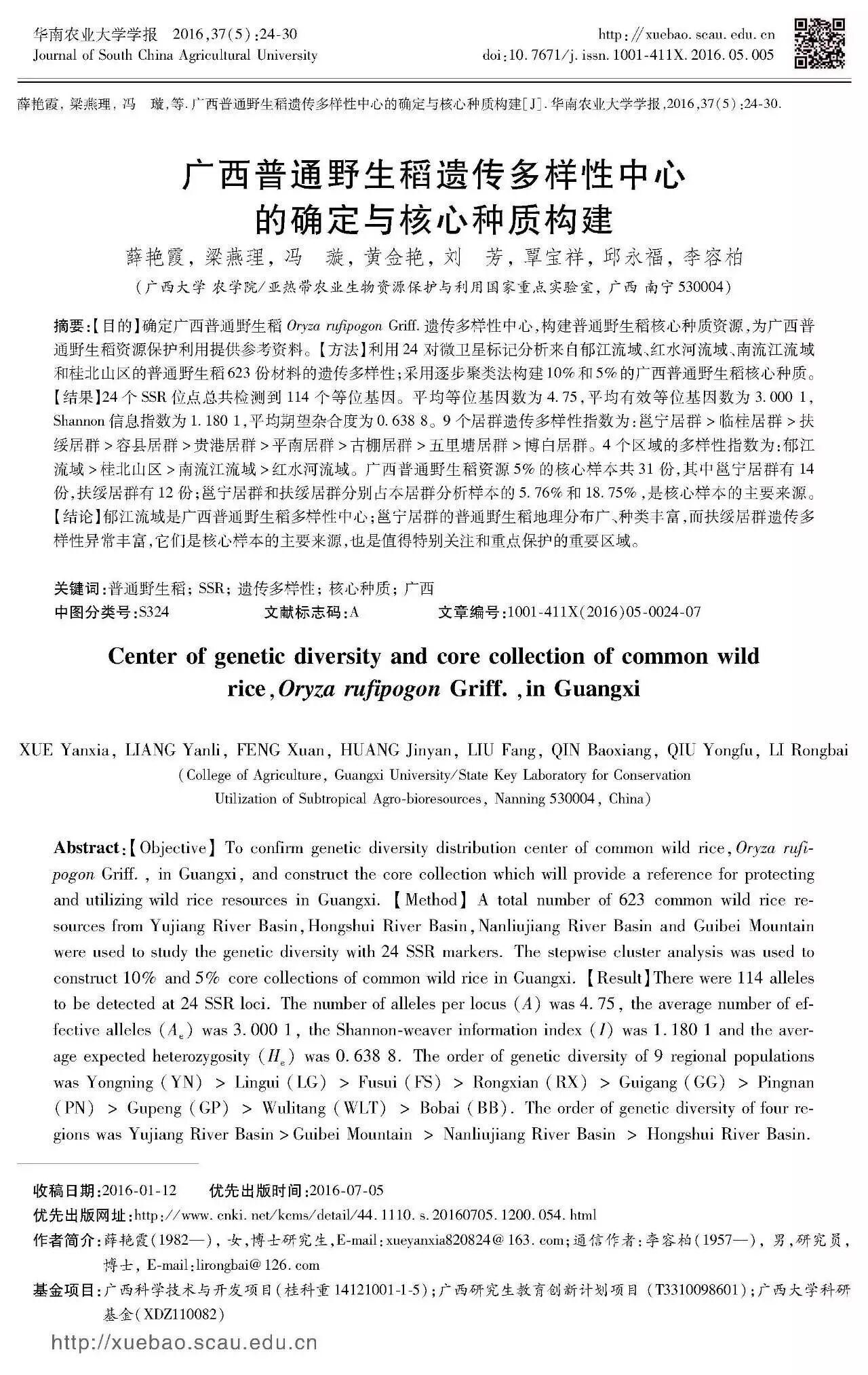 首页 | 美妆知识 | 本期推荐#广西普通野生稻遗传多样性中心的确定与核心种质构建# 本期推荐#广西普通野生稻遗传多样性中心的确定与核心种质构建# 2023-04-19 23:50:29 普通野生稻是亚洲栽培稻的祖先种,经过长期的自然选择,蕴藏着大量可供育种利用的基因资源。因此,保护和利用普通野生稻是该领域科研工作者关注的重点。许多研究表明,我国普通野生稻遗传多样性丰富且地域特性明显。