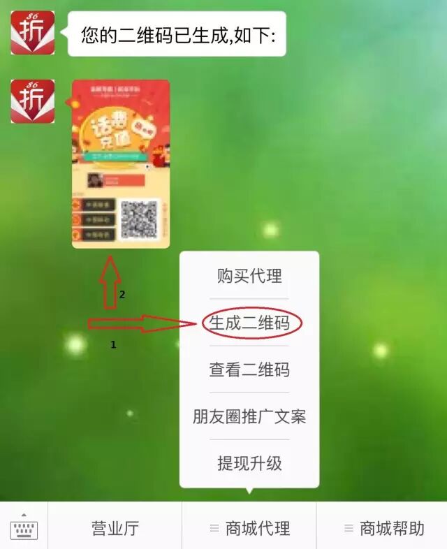 如下图 首先点击商城代理--生成二维码---系统会发送二维码给您,点击图片放大,然后长按图片--保存到本地即可!