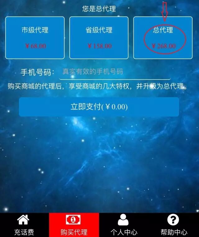 您成功购买68元市级代理 市级代理每个月有100元优惠额度,可充100元话费,话费可给自己充,也可给他人充! 推广代理三层收入 下级充值话费三层奖金 (代理收入) (话费收入) 一级:21元 一级:4元 二级:9元 二级:2元 三级:5元 三级:1元 市级代理推广的下级无论是什么等级代理,奖励都如上! 您成功购买158元省级代理 省级代理每个月有200元优惠额度,可充200元话费,话费可给自己充,也可给他人充! 推广代理三层收入 下级充值话费三层奖金 (代理收入) (话费收入) 一级:42元 一级:8元 二级:18元 二级:4元 三级:10元 三级:2元 省级代理推广市级代理则享受市级代理的佣金政策! 省级代理推广省级代理,总代理,则享受省级代理佣金政策! 您成功购买268元总代理 总代理每个月有300元优惠额度,可充300元话费,话费可给自己充,也可给他人充! 推广代理三层收入 下级充值话费三层奖金 (代理收入) (话费收入) 一级:84元 一级:12元 二级:36元 二级:6元 三级:20元 三级:3元 总代理推广市级代理则享受市级代理的佣金政策! 总代理推广省级代理则享受升级代理的佣金政策 ! 总代理推广总代理则享受总代理的佣金政策! 模拟收入[以总代理佣金为例] 购买总代理258元,并发展30人 (每层都按照发展30人计算收入如下) 收入1:发展代理 第一层30人 *84=2520 元 第二层900人 *36=32400 元 第三层27000人*20=540000元 合计57.5万 收入2:话费提成 第一层30人 *12=360 元 第二层900人 *6 =5400 元 第三层27000人*3 =81000元 合计8.7万 一共合计57.5万++8.7万=66.2万