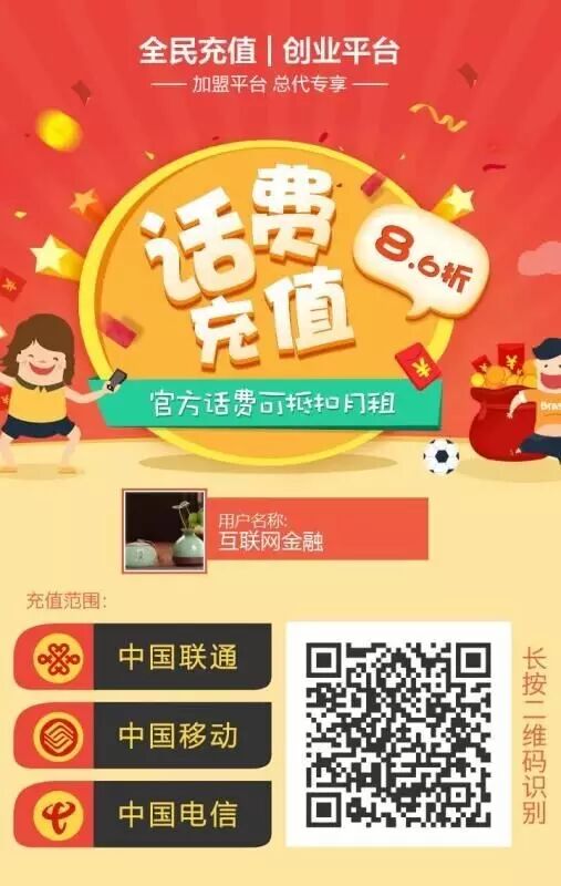 关于话费充值折扣平台 2016年,华夏大地,,下自地方各级政府力倡互联网+模式;大众创业、万众创新。互联网+的成功运营,颠覆原有的营销模式。在此背景下,广西长彩信息科技有限公司旗下力推的便民平台,凭借(百度、阿里巴巴、腾讯、移动、电信、联通)中国授权服务商实力,秉承“汇民”、“惠民”、“慧民”三大宗旨。结合移动互联网+,首倡社会化分销赢销模式运营手机充值平台。 市场前景怎么样? 在我们『折扣平台』可以得到实实在在的省钱。作为我们平台的代理商不仅可以帮助身边的朋友省钱,自己还可以得到平台给予可观的佣金。『折扣平台』不仅可以兼职,还可以做为一份事业来做,通过自己坚持不懈努力发展平台代理商,系统在升级您在本平台尊贵身份的同时,还可以进行自我销售,每一份代理以及话费充值,都有对应佣金奖励, 何乐为不为呢! 为何选择话费折扣商城 【背景深厚】:话费折扣商城由总公司(广西长彩信息科技有限公司)直接控股运营,公司强大的实力,是代理商的坚实靠山 【收益高企】:话费折扣商城通过微信平台终身锁定终端,采用合法三级分销、三级分润的模式。您接下来要做的就是利用业余时间,分享您的二维码! 【回报快捷】:只要您的朋友通过您分享平台推送的推广二维码名片,成为代理,或是充值话费,您都将终身获得相对应佣金。通过互联网快速的传播,代理商和粉丝完美裂变,收入成几何式增长。 【结算神速】:话费折扣商城手机充值平台强有力的资金结算能力,无需您填写任何资料,只要您向后台发起提现申请,将直接提现到您的个人微信零钱。满50即可提现!