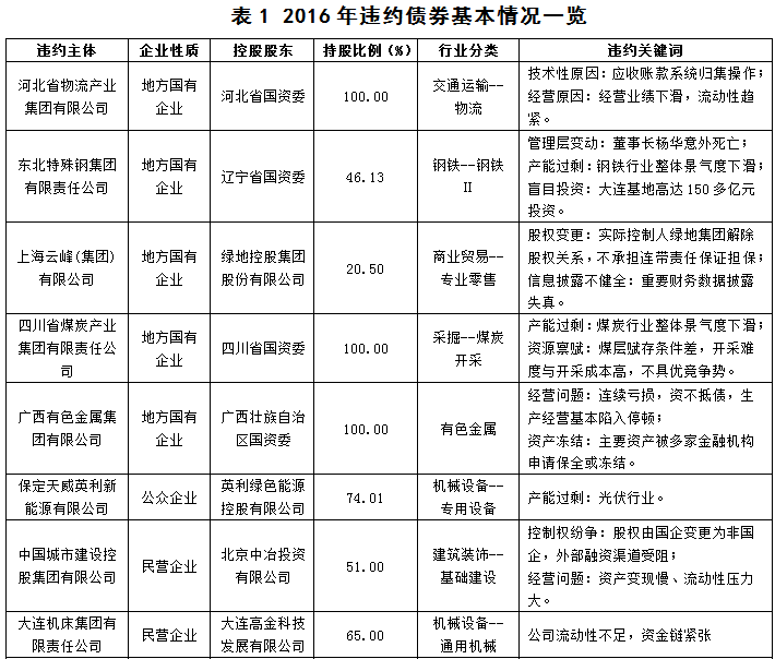 以下是2016年违约债券的违约主体、企业性质和违约原因汇总表:
