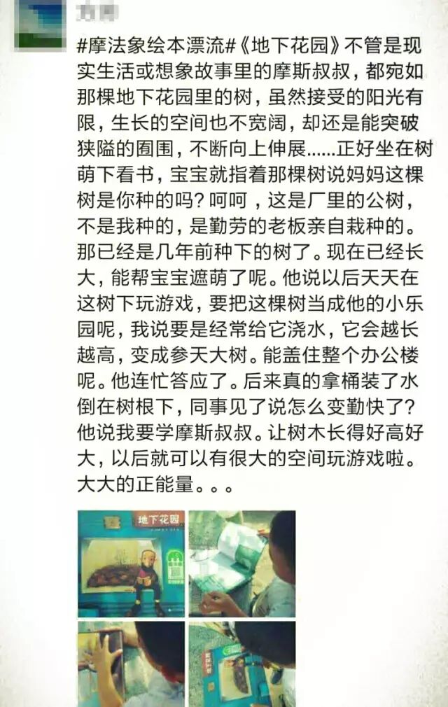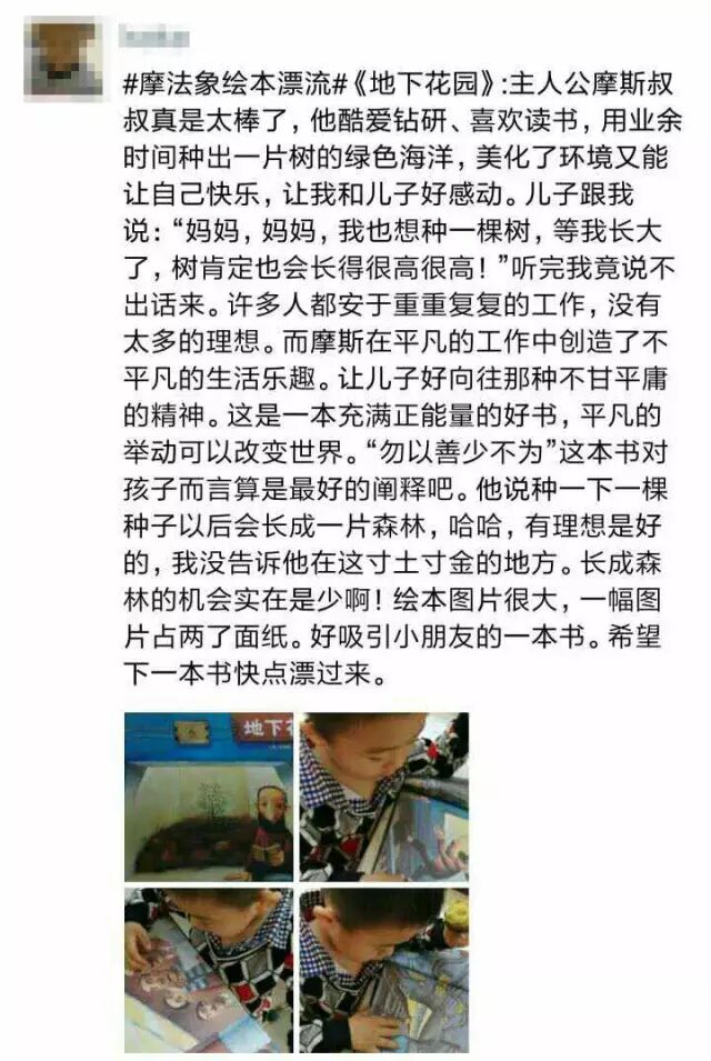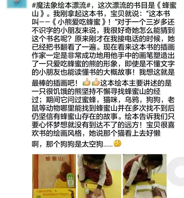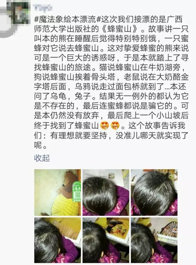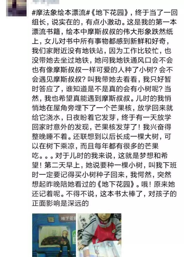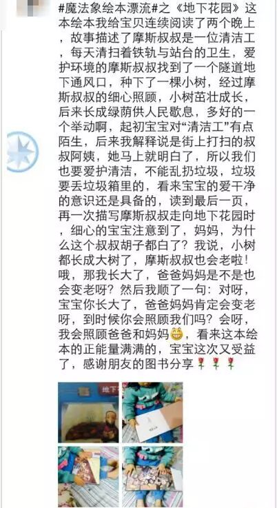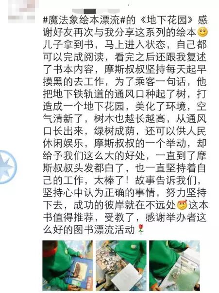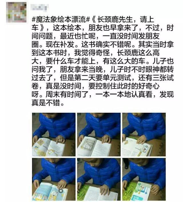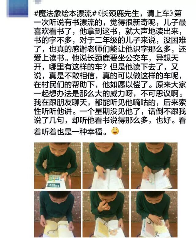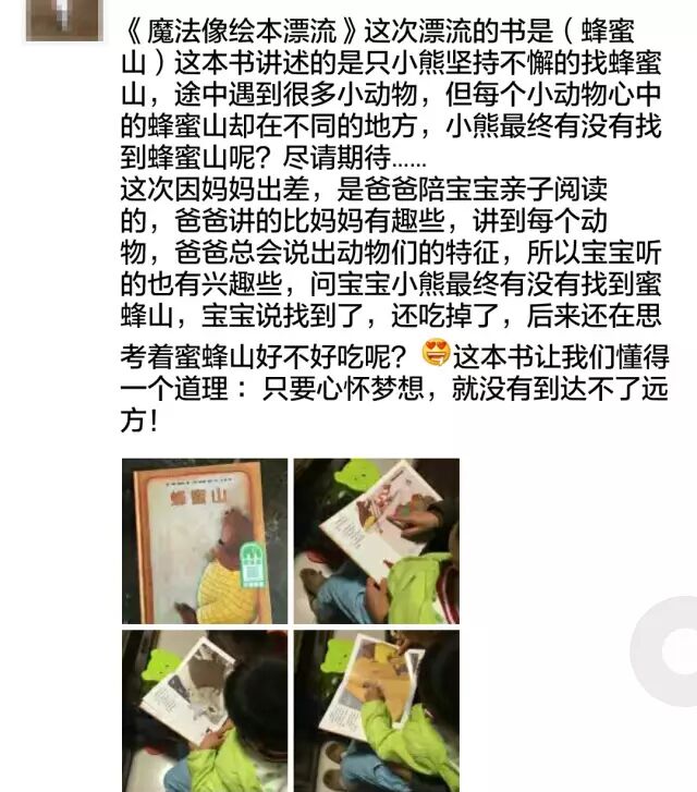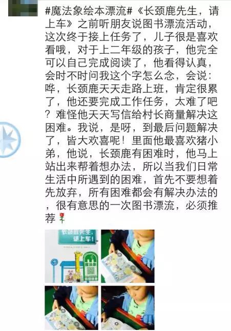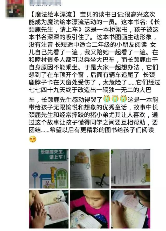 为期1个月左右的漂流,每位漂流组长都如期完成任务;每位接漂家庭的反馈我都用心阅读,很感动,很欣慰!我们的漂流影响力逐渐扩大,每期都有很多新家庭加入;我们的目的纯粹,把最优秀童书带给孩子,在提升亲子关系的同时,孩子也能从书中汲取营养,阅读的效果就是这么神奇,亲子关系更融洽了,孩子更懂事了,每个家庭都有小小的变化,对于社会来说将是大大的进步;对于做公益的我们,也就心满意足了。