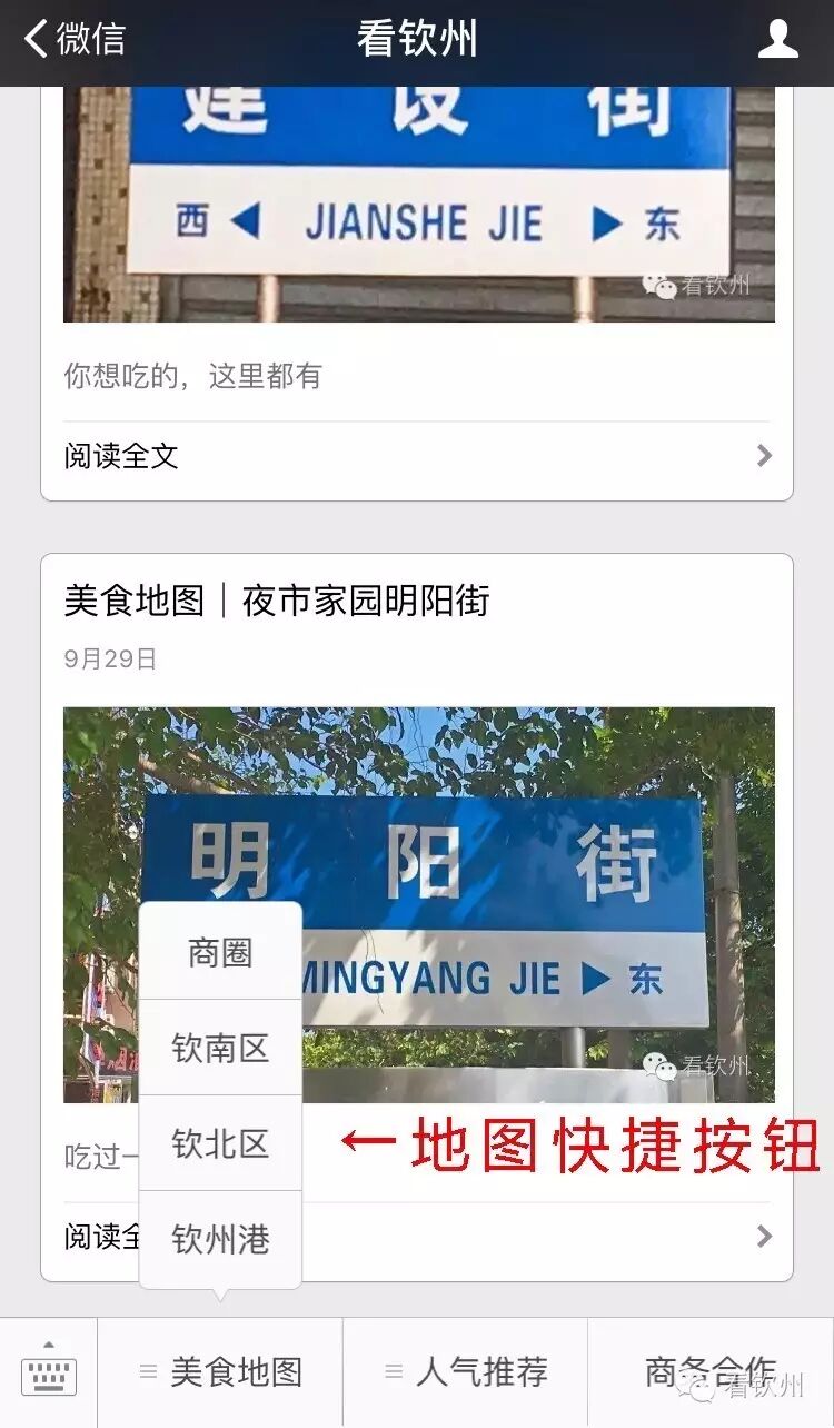 2/2 点开【看钦州】微信公众号,点击底部【美食地图】就能选择商圈,三大区的主要美食店铺都被小编收了,喇喇声收藏吃个遍呀!