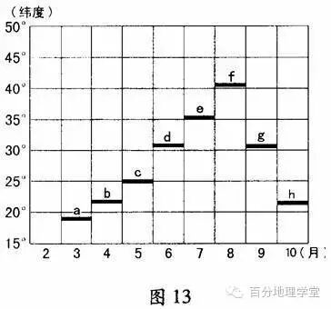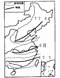 (2006年普通高等学校夏季招生考试地理江苏卷(新课程))图13是“我国东部锋面雨带正常年份位置变化示意图”,读图回答29~30题。