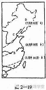 【解析】我国雨带推移规律:4~5月份华南一带,6月份江淮地区(该区出现梅雨天气),7~8月份东北、华北一带(江淮地区出现伏旱天气)。