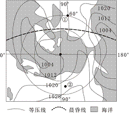 【解析】从图中等压线分布可知②位于亚欧大陆,在亚欧大陆内部出现高压中心,则为北半球冬季,又由于虚线为晨昏线,且与70°N相切,即可推出太阳直阳直射在23° 26'′ S较近),12月22日太阳直射在23° 26′S,则图示现象可能出现在1月。