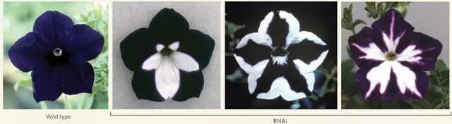 但这种加法终究不能解决所有的问题,有时候塞进去的基因根本就不工作,有时不但不工作,甚至还拖后腿。1990年的时候,有位叫理查德•约根森(Richard Jorgensen)的科学家想获得一种深紫色的矮牵牛,于是把一段加挂强启动子的色素基因给插到了紫色矮牵牛的基因组里面。按理说,合成色素的基因多了,那合成的色素理所当然应该增多啊。科学家就指着卖了这个品种写本子,报基金呢。但是问题来了,这些转基因矮牵牛的颜色没有变深,反而变白了,得,这基金是申报不成了,连孩子的圣诞节礼物都买不成了。