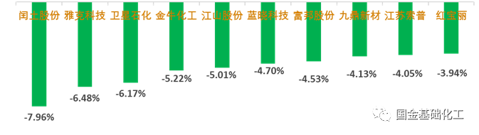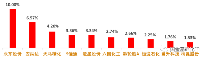 新纶科技、宏大爆破、湖北宜化、鲁西化工、炭黑(黑猫股份、永东股份)、TDI(*ST沧大)、粘胶短纤(三友化工、南京化纤、澳洋科技、中泰化学)、钛白粉(佰利联、安纳达、金浦钛业、中核钛白)、新疆天业。