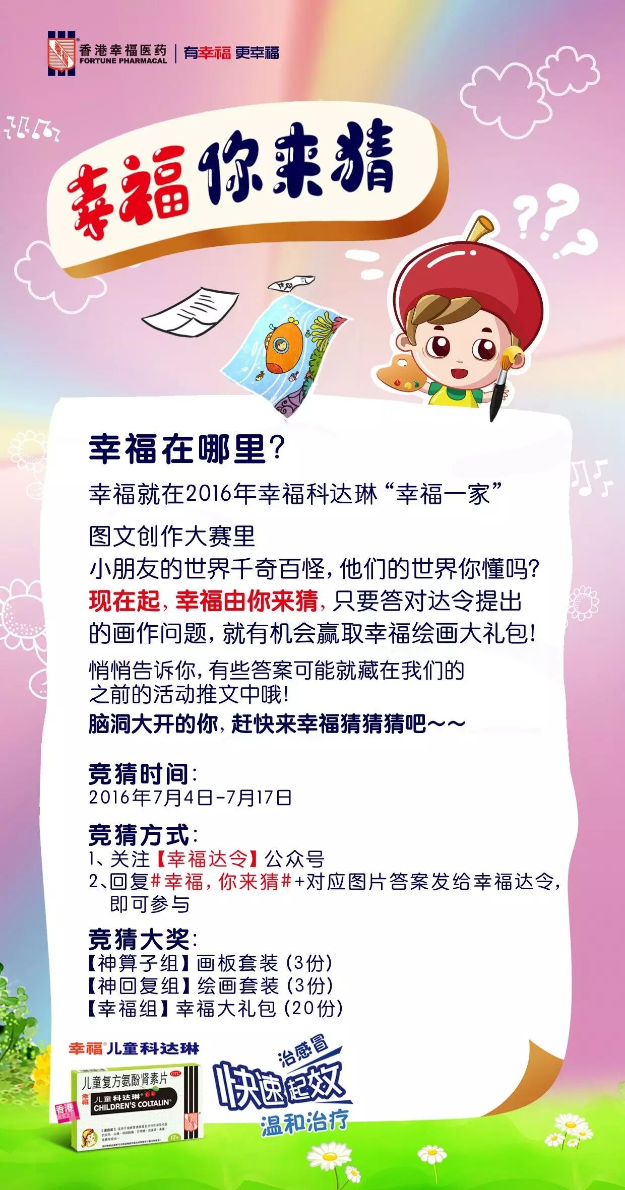 7月15日前,广西、云南、南京、昆山、四川、重庆的小朋友完成画作后,将画作拍下来,关注“幸福达令”官方微信,点击【幸福绘画【→【上传画作】就可以上传参加比赛,只要上传即可领取1-50元的红包一个哦。赶快拉上亲朋好友为你投票吧!别怪我没告诉你:获得人气奖前10名的小朋友,可赢得价值1000元的礼品哦!!!