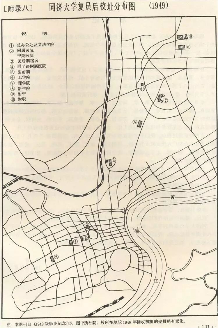 1946年开始,,同济成为斜跨上海市区、分散十多处的“大学校”。其中工学院位于其美路(现四平路)的原日本中学,学校办公室和医学院位于善钟路100弄10号(今常熟路),附属医院分别为白克路上的中美医院(原宝隆医院,今凤阳路)和同孚路82号(现石门一路)的原德国医院,理学院在平昌街日本第七国民学校内(现国顺路上海电视大学),文法学院在四川北路(现复兴初级中学),新生院位于江湾新市区的市图书馆(现黑山路),高级工业职业学校则在江湾魏德迈路(现邯郸路),附属中学位于市博物馆(现长海医院飞机楼)。