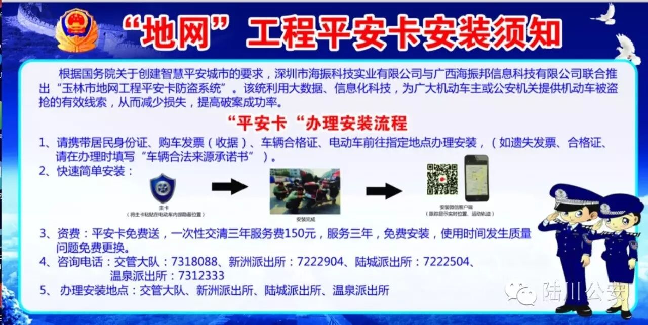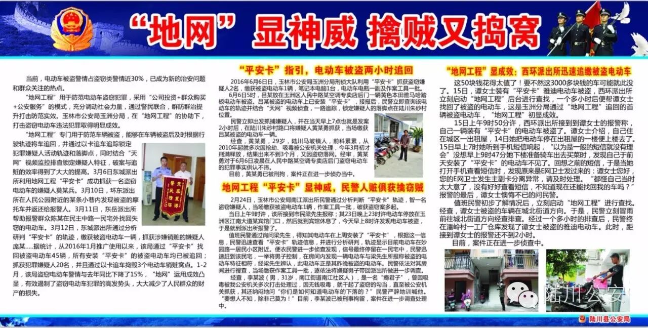 据介绍,陆川县在前期建设好的“天网”一、二、三期的基础上,又增加了“地网”,“天网”和“地网”将互为补充,组成打击犯罪、服务群众的天罗地网。自推行“地网”工程以来,玉州区从2016年1月到6月,通过“平安卡”找回被盗电动车115辆,所有安装“平安卡”的被盗电动车,均已被追回;抓获各类违法犯罪嫌疑人54人。并且通过以卡追车捣毁了3个电动车销赃窝点,盗窃电动车警情与去年同比下降15%以上,有效遏制了盗窃电动车犯罪的高发势头,减少了人民群众的财产损失。玉州区的经验充分说明,“地网”工程是一张“先进、实用、高性价比、易推广应用”的新型技术防控网。