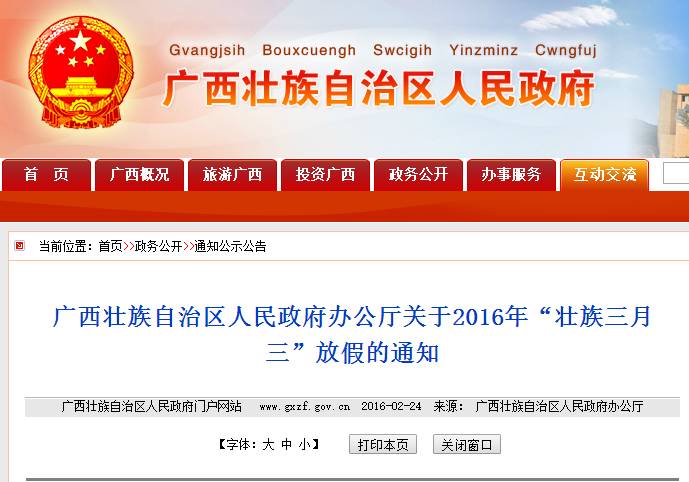 马上登录广西壮族自治区人民政府官网查阅了文件,没有见到类似的有关三月三放假的通知。随后,有记者致电广西壮族自治区人民政府办公厅,得到的消息是目前还没有接到关于三月三放假的通知,根据往年的习惯,一般是三月三将近时发相关放假的通知。