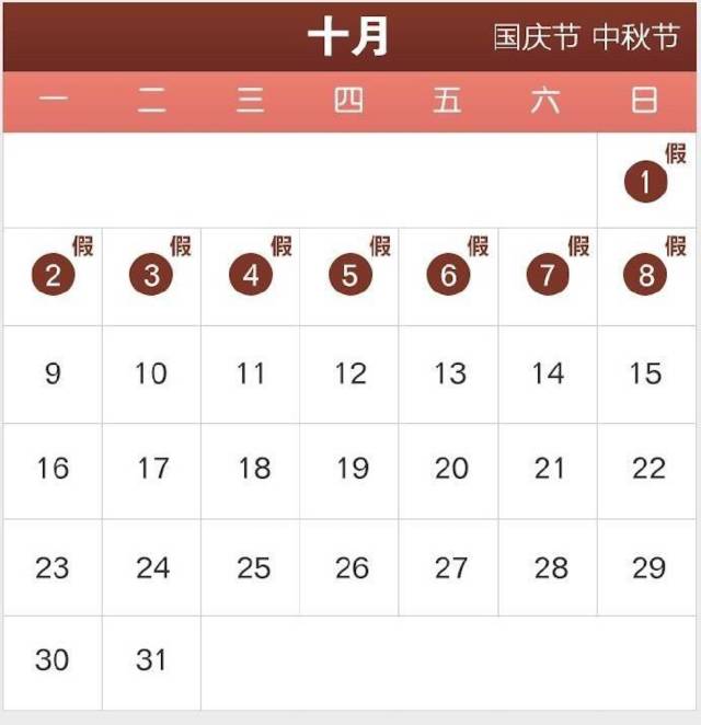 法定:2017年10月1日至10月8日为国庆,中秋和国庆重合,共8天