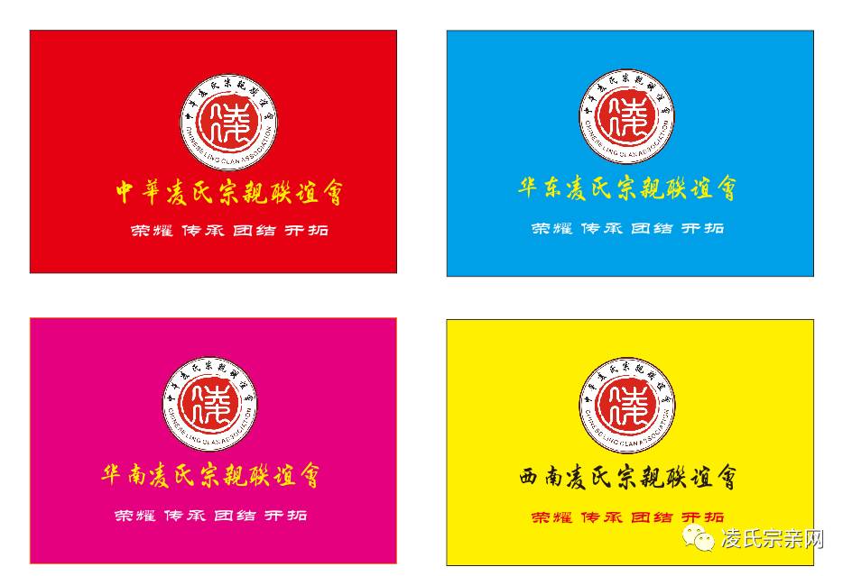 各地宗亲会的会旗建议可采用同样的图案,将中华替代为相应区域为省、地市、县的名称。如“华东凌氏宗亲联谊会”、“安徽凌氏宗亲联谊会”、“广西玉林凌氏宗亲联谊会”等。