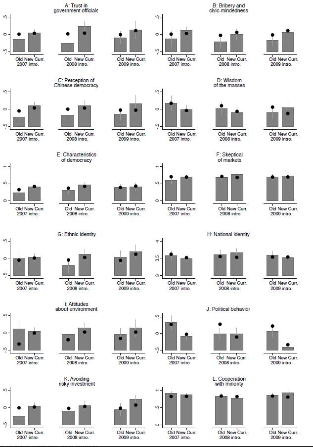 我们在本篇推文中,只给大家展示图例。上图中作者以各省引入新教材的年份为基准划分的新旧教材各自对应的学生群,分别计算各类态度问题答案标准化后的Z-score均值,然后进行比较。总的来说,、、经济制度、风险偏好等态度有着积极影响,这正是政府所希望看到的。然而,对身份认同感、民族认同感和环境的影响并不明确,是复合的。