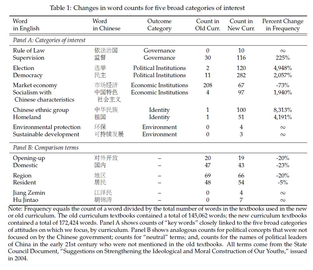 更细而言,,因为其是专为“思想道德教育”而设。2004年,,。不像其他科目的教材在地区上存在多样化,,第8次课程改革后同样是采用统一内容的新一套教材。因此,作者可以综合比较新老版本的具体内容变化,。虽然新教科书保有原教材的大部分内容,但是一些内容变化还是不小,有完全被删除的章节,也有被广泛修订的章节,同时也添加了不少新内容。对应的,。这一系列引人注目的课程改革与政府文件中概述的目标是一致的。:(i)对政府治理的看法;;(iii)对经济机制的认可;(四)学生对民族、国民身份的认同感;及(v)对环境的态度。