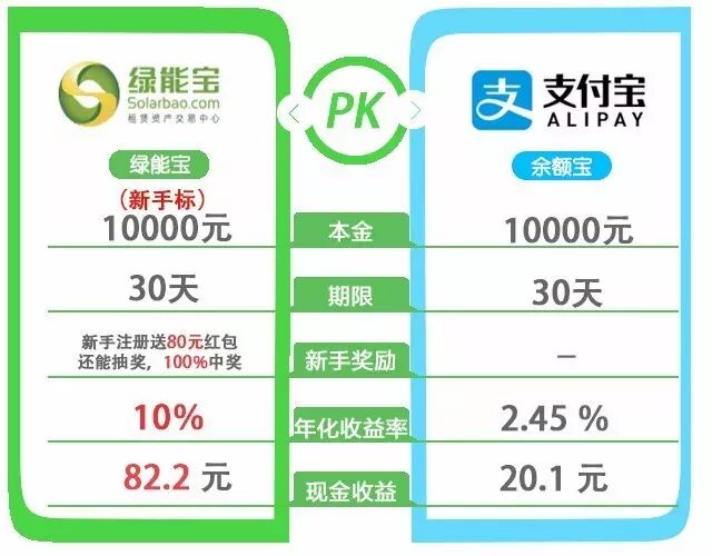 绿能宝收益可观,新手标收益可达10%,收益是余额宝的4倍以上!以1万元为例,30天余额宝收益为20元,绿能宝收益却达到82元。