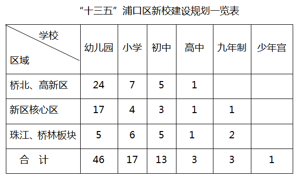 “十三五”期间,浦口将一共新建学校(含少年宫)83个,其中幼儿园46个、小学17个、初中13个、高中3个、九年制学校3个、少年宫1个。浦口区教育局安全与建设科科长胡伟表示,这些学校将会在2020年以前全部交付,数量只多不少。
