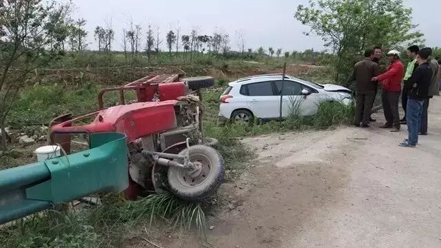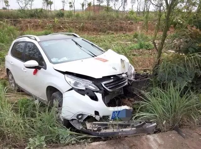 随后,民警赶到,检查发现,一盏路灯杆被拦腰撞折,顶上两盏路灯掉下来摔碎,道路右侧,一辆白色的东风标致轿车跌出路面,引擎盖凸起变形,左车灯处有一处与路灯杆撞击后留下的痕迹,保险盖处脱落,而前方,侧翻着一辆三轮摩托车。