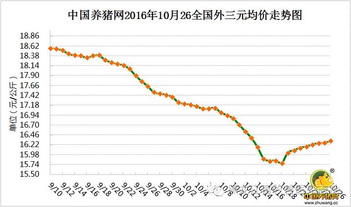 在2016年猪价11月涨幅或扩大 将有可能上升,10日26日全国生猪均价上涨地区较多,下跌地区较少。幅度在-0.42至1.20元/公斤之间。10日26日全国生猪平均价格为16.33元/公斤,较昨日猪价上涨0.05元/公斤,较上周猪价下跌0.29元/公斤,江西省、江苏省、福建省、陕西省、甘肃省、湖南省、广西、广东省、辽宁省、四川省和云南省下跌,其余各省市均出现一定幅度的上涨或持平;涨幅维持在0.02-1.20元/公斤,跌幅维持在0.01-0.41元/公斤。