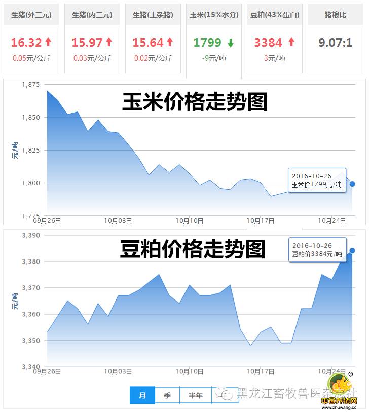 10日26日全国玉米平均价格为1799元吨,比较昨日价格下降9元/吨,与上周价格对比上涨7元/吨,猪粮比为9.07:1;10月26日国内豆粕均价为3384元/吨,比较昨日价格上涨3元/吨,比较上周价格上涨35元/吨。