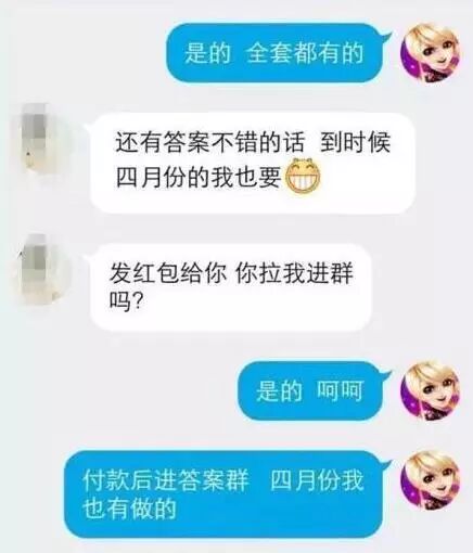 另有媒体报道,每逢大考就有人在各种高考群、学习群散布卖答案的消息,“苏瑾年”“阿乐学长”“义帝”这样的人已活跃多年,其他省份考试中也有他们的身影。以“义帝”命名的QQ助考群不下10个,涉四川、广西、湖北、福建等多个省份。其专属总群成立于2015年4月份,宣称“打造全网最优惠的价格,做出最有质量的答案”。