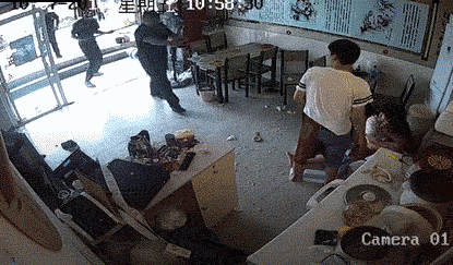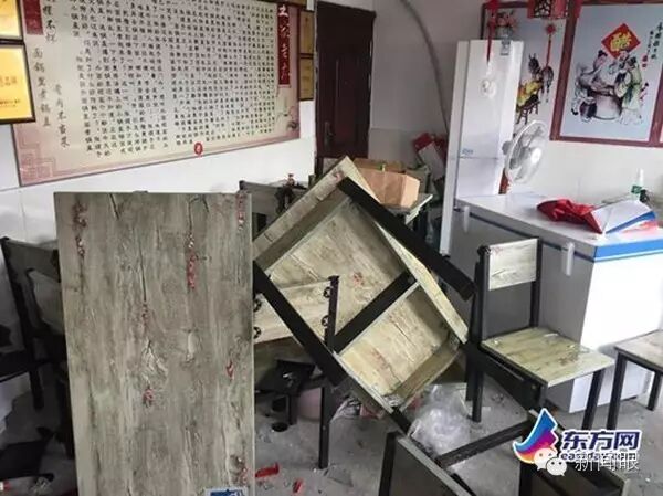 散落一地的玻璃碎屑,七倒八歪的桌椅板凳,面店内一片狼藉。