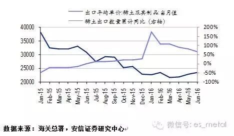 1.2015年7月1日稀土出口配额、关税取消后,稀土出口“价跌量增”的现实没有改变,供给侧改革不改不行。截至2016年6月,海关统计的稀土出口量累计同比增加67%,出口平均单价同比下降23%,今年上半年的出口量基本相当于2015年全年出口量的70%,稀土贱价外流如果持续下去,再过15年国内的重稀土资源就会流失殆尽,而由于黑稀土劣币驱逐良币打压稀土价格,稀土产业没有正常的商业利润的局面也会严重阻滞稀土深加工的投资和研发进程。
