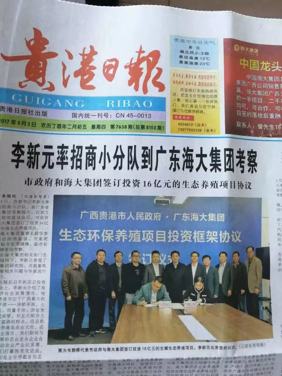 3月1日,广西壮族自治区贵港市委书记李新元率贵港市委、市政府招商小组一行,莅临海大集团进行招商考察,在双方项目投资座谈会后,海大集团与贵港市政府签订了16亿元的生态养殖项目。
