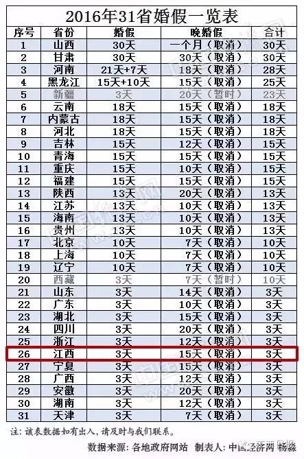 值得注意的是,婚假和户口并无关系,只与工作地有关。也就是说,在江西上班的山西人,你只能休3天;江西人在山西工作,就可以享受30天的超长假期了!