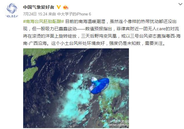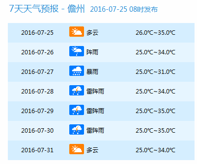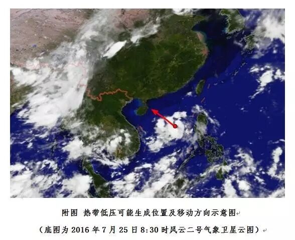海南省气象台的天气预报 目前,南海东部海面有热带云团发展,预计将于今天加强成为热带低压,之后向西北偏西方向移动,27日向本岛东部至粤西一带沿海靠近,后期不排除加强成为热带风暴级的可能,26日~27日将给我省陆地和海洋带来明显风雨天气。 省气象台预计,25日,全岛多云,西部、中部和南部的局部地区午后有雷阵雨;全岛最高气温33~36℃。 26日白天,全岛多云,西部、中部、东部和南部的局部地区午后有雷阵雨;全岛最高气温32~35℃。 26日夜间~27日,受南海热带低压影响,北部、中部和东部地区有大到暴雨、局部大暴雨,西部和南部地区有中到大雨、局部暴雨;本岛东部沿海和北部沿海陆地将伴有7~9级大风。 28日~31日,全岛多云,西北部和中部的局部地区午后有雷阵雨,南部的局部地区早晚有阵雨;全岛最高气温32~35℃。 海洋方面:25日白天,各预报海区风力5级、阵风6级。25日夜间~26日白天,受南海热带低压影响,南海东中部海域风力6~8级,其余各预报海区风力5~7级。26日夜间~27日,南沙和中沙群岛附近海面风力6~8级,其余各预报海区风力将逐渐增大到7~9级、阵风10~11级。28日起,各预报海区风力减小。 省气象部门提醒,南海热带低压将于今天生成,之后强度还将继续加强,并迅速向我省东部近海靠近,请在南海海域作业的渔船和过往船只注意回港避风。