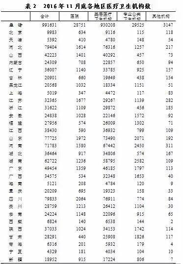 再来看看截止2016年11月底,各地区医疗卫生机构数量的情况。从高到低医疗机构总数排在前十的分别是:四川、河北、山东、河南、湖南、广东、山西、江西、陕西、湖北。