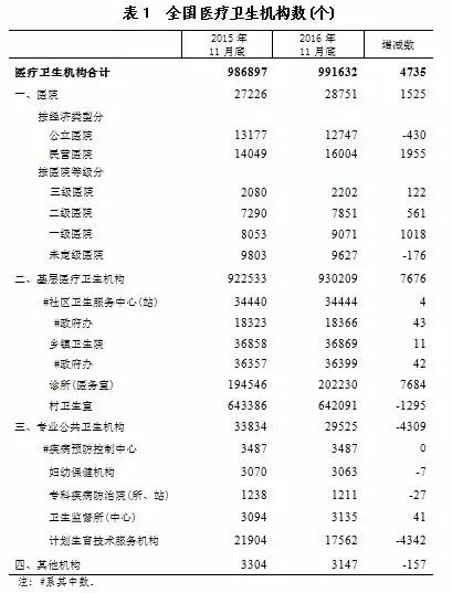 此前,2月24日,国家卫计委统计信息中心也曾发布统计结果,截至2016年11月底,全国医院数量达到2.9万个,其中公立医院12747个,民营医院16004个。