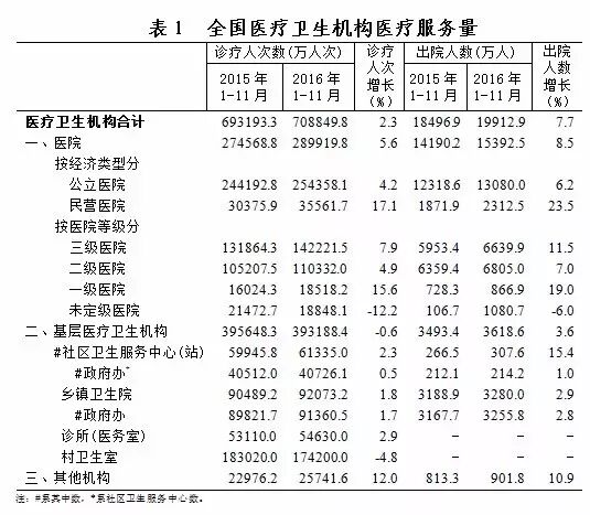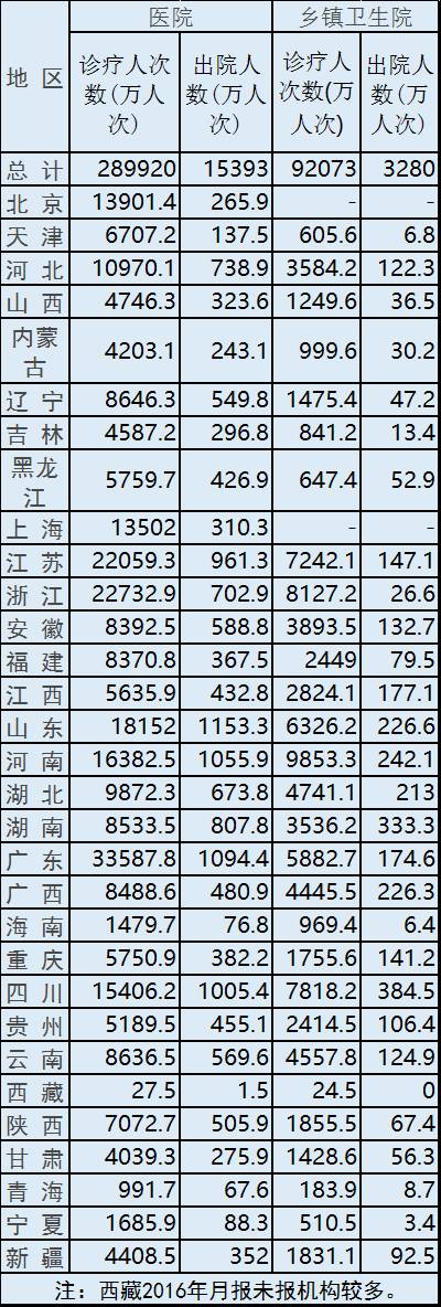 2016年,全国医疗机构诊疗人次和出院人数表