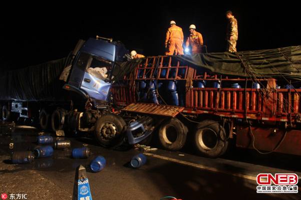 消防官兵到达事故现场后看到,一辆满载饲料添加剂的货车追尾一辆满载涂料的大货车。