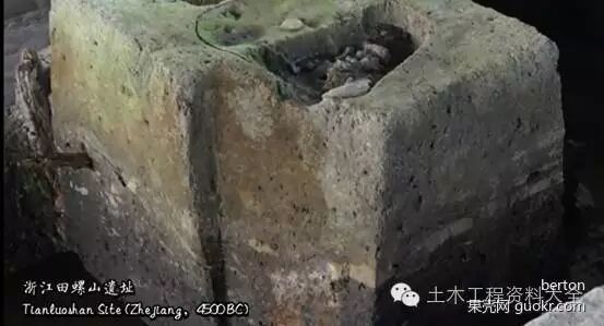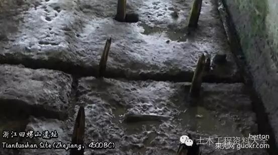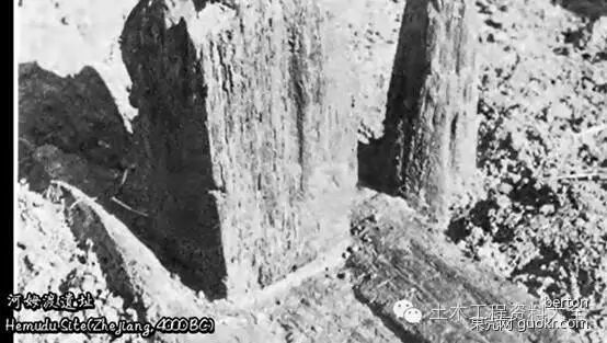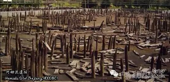 1973年在浙江余姚发现的河姆渡的遗址中,在地势低洼的地方发现了大量木杆的遗迹以及人类活动的痕迹。与以前发现的遗迹中绑捆木头的方式不同,河姆渡遗迹中的