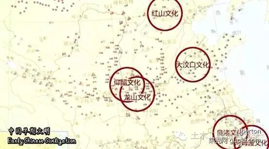 从公元前1万年的旧石器时期到公元前五千年的新石器时期开始,中国出现了仰韶文化、红山文化、大汶口文化、河姆渡文化等,这些文化从地区分布可以分为南方的河姆渡文化、陕西为中心的仰韶文化以及东北沈阳包括内蒙的红山文化。根据不同文化的地理环境、所有的材料以及生活方式产生的不同特征的建筑形式。