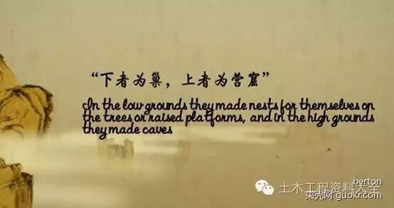 “下者为巢,上者为营窟”,即地势低洼的地方,人们向营造鸟巢一样将建筑架在木杆上,而在黄土高原等地势较高的地方,人们挖一个洞住在里面。从而有了“穴居”和“巢居”两种方式。