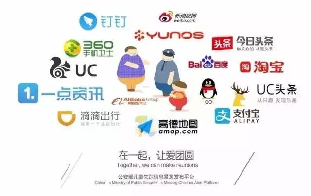 除了“团圆”一期接入的钉钉、高德地图和微博,阿里巴巴这次基本全通道all in,只要在平台上发布孩子丢失的信息,手机淘宝、支付宝、UC浏览器、YunOS操作系统等阿里系软件都会实时推送寻人信息。这将大大提升失踪儿童信息的覆盖范围,真正举社会之力,实现“天下无拐”。