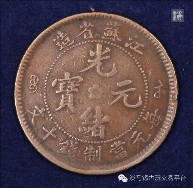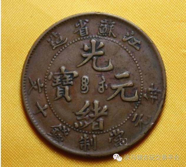 光绪二十八年(1902年),。一、江苏省造壬寅光绪元宝十文铜圆正版铜圆的正面是:上缘“江苏省造”,“江苏省造”的两侧左“寅”右“壬”,下缘“每元当制钱十文”,中间是直读“光绪元宝”,中心有两个满文,译成汉字是“宝苏”两个字,左“宝”由“苏”。有珠圈,珠圈是由99个小点组成。背面是几种飞龙。具体探讨如下:1.背面上缘“KIANG-SOO”,下缘“TEN CASH”,两侧各有一个实心五瓣花,中间一条长七尾飞龙,即从上往下数第三根尾毛和右边的云朵相连,第四根龙尾毛比第三根更长。有珠圈,珠圈是由109个小点组成。是齿边,在一公分的弦相对的弧边上有16条齿线江苏省壬寅光绪元宝背长七尾飞龙齿边2.背面上缘“KIANG-SOO”,下缘“TEN CASH”,两侧各有一个实心五瓣花,中间一条长七尾飞龙,即从上往下数第三根尾毛和右边的云朵相连,第四根龙尾毛比第三根更长。有珠圈,珠圈是由109个小点组成。光绪元宝,分为3个圈 里面写有光绪元宝,中间写江蘇省造 库平七钱二分 外面写有银样币禁止流通。 背面中间有一条盘龙边缘是英文字母