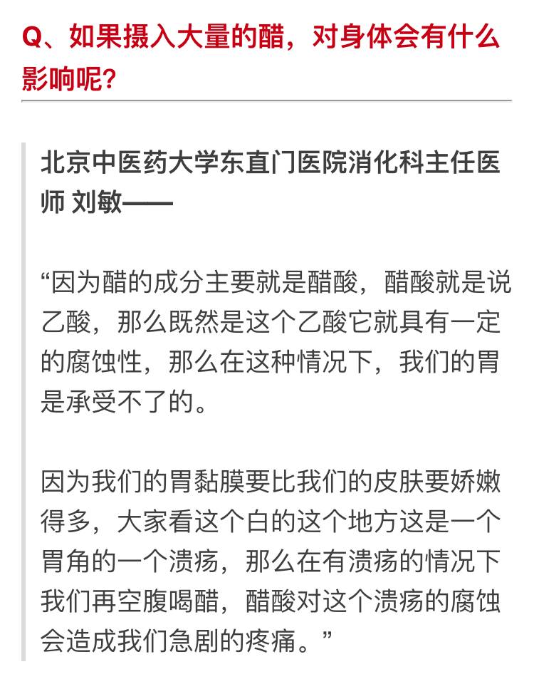 “醋它主要就是开胃、消食。另外就是杀菌,再有就是有一个化瘀散结的一个作用。一天的食醋量不能超过6毫升。”